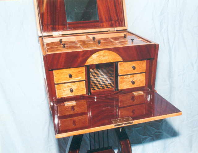 Ausführung in Mahagoni, massiv und furniert, Fadenintarsie in Ahorn, Deckel der Inneneinteilung und Schubkästchenvorderstücke in Birke- Maser